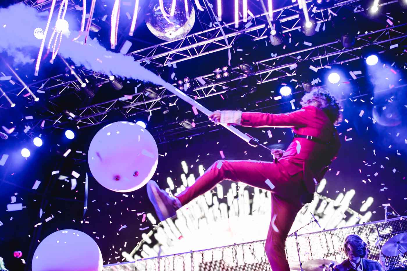 El viernes comenzó con el encanto de Lidia Damunt embaucando a los presentes desde es escenario de la barca varada entre los pinos. Poco después, el rock clásico enriquecido de sonoridades paralelas de Dr. Dog se convirtió en un aperitivo perfecto para Devendra Banhart en el escenario principal. El venezolano salió al escenario con una vestimenta peculiar, y una coqueta/chubasquero atado a la cintura, ocultando su escuálida figura, que movía de un lado al otro del escenario, totalmente absorbido por sí mismo. Entre canción y canción se pierde contando historias, disertando sobre la vida y el amor y mostrando su hippismo recalcitrante, a la vez que su sentido del humor (espero): “nunca te sientas solo, miles de microorganismos viven dentro de ti”. Sonaron “Saturday Night”, “Für Hildegard von Bingen” y cerró con “Carmensita” un concierto más corto de lo que se esperaba y con el espíritu de Caetano Veloso presente durante todo el set. Depués nos trasladamos a los sesenta con Real Estate y sus armonías vocales. Desde su paso por el Primavera en 2014, llevábamos esperándolos con ganas, después sobre todo de su último disco “In Mind”. Ofrecieron un show impecable. Aunque echamos de menos “Talking Backwards”, tocaron otras piezas más “raras” como “Wonder Years" de su disco “Days”. Acabaron puntuales y la gente se quedó con ganas de más, gritando un buen rato pidiendo que volvieran al escenario. Se respiraba entre el público verdadera devoción por una banda que sin duda desprende amor y remueve sentimientos. De nuevo en el bosque, el poco tiempo que pudimos dedicar a Los Punsetes no acabó de enganchar. Nos faltaron sus hits incontestables y la actitud de Ariadna no ayuda nada, claro. Era el turno de The Flaming Lips en el escenario principal y sí, llevan quince años con el mismo espectáculo, pero ese comienzo con “Race For The Prize” y el consiguiente estallido de colores fluorescentes, confetti y explosiones de humo, ya te traslada a ese mundo de arco iris, globos, setas, unicornios y estrellas en el sentido más literal, porque ahí está, todo ante ti. “Yoshimi Battles The Pink Robots”, “The Yeah Yeah Yeah Song” y una versión de “Space Oddity” ampliamente coreada. Grandes canciones, gran atrezzo y gran frikismo de un Wayne Coyne que sigue haciéndonos sufrir con su falta de voz. Muy bonito todo, pero ya lo hemos visto muchas veces. Seguidamente La Casa Azul fue una fiesta total, pues el ambiente ya estaba caldeado. “La revolución sexual” fue el gran momento sin duda. John Talabot cerró la segunda jornada con un set a la altura. Una pinchada muy parecida al disco set de tres horas del Primavera y a su disco con Talaboman, repitiendo incluso muchos temas. Si Erol tiró por el electro-acido, Talabot destaca por su vertiente más tribal (africana).