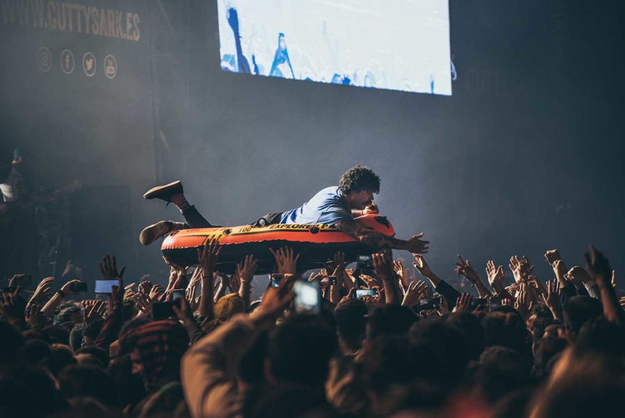 “Somos más viejos y más enfermos que hace dos años, pero lo daremos todo igualmente”. Con esta premisa encaraban sus 90 minutos Talco. Un concierto más, un directo típico, donde los pogos y los bailes entre punkis estuvieron más enchufados que algunos momentos del directo de Dema, el vocalista. Estuvieron correctos, defendiendo algunos de los temas de su último trabajo “And the winner isn’t” (HFMN, 18), pero tirando hacia los hits: “L’odore della morte”, “St Pauli”, “Danza dell’autunno rosa” y compañía. Siendo realistas, era lo que la multitud esperaba para darlo todo. En el escenario Biobizz, antiguo Viña Grow, Green Valley presentaban “Bajo la piel” (Mundo Zurdo, 19), nuevo álbum que lleva poco más de una semana en los estantes. Los kilómetros que pateamos entre escenario y escenario para llegar a ver a más de un grupo en una sola franja horaria, no se quedaron para nada cortos. Subimos el cuentakilómetros otra vez para llegar a SFDK y ¡madre mía! vaya público arrastran y crean cada vez que tocan en el Viña Rock. Esta vez se subieron al escenario co-principal y dejaron la actuación de rap más multitudinaria de la jornada. Entrada la madrugada trajeron el frío asturiano Desakato, pero no por mucho tiempo, ya que pocos minutos tardó Pepo en lanzarse a surfear el público. Un recurso tan utilizado por la banda que la mayoría de la gente ya predecía el acontecimiento con los brazos alzados por si caía el cantante de la nada. Y así fue, con “Humo negro” empezó a bucear entre el público, para volver minutos más tarde con “Pánico en Frankfurt” montado en una barca hinchable que navegaba por encima de la multitud como si se encontrase en medio de un temporal. El directo de Desakato suele ser uno de los más esperados de cada edición en la que forman parte y, aunque suelen pasar más cosas abajo del escenario que encima de las tablas, no defraudaron y dieron al público lo que esperaban. Ni más, ni menos.