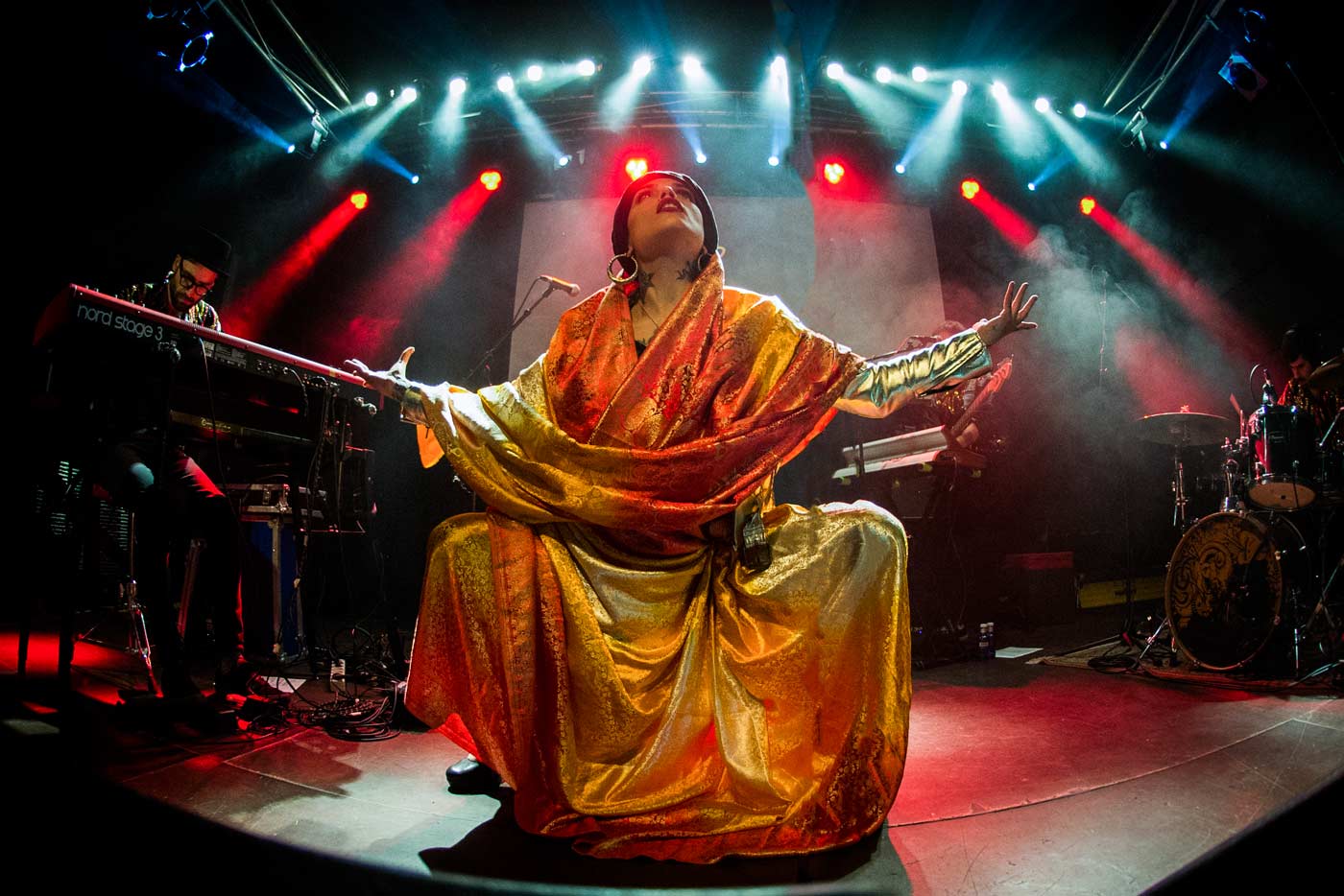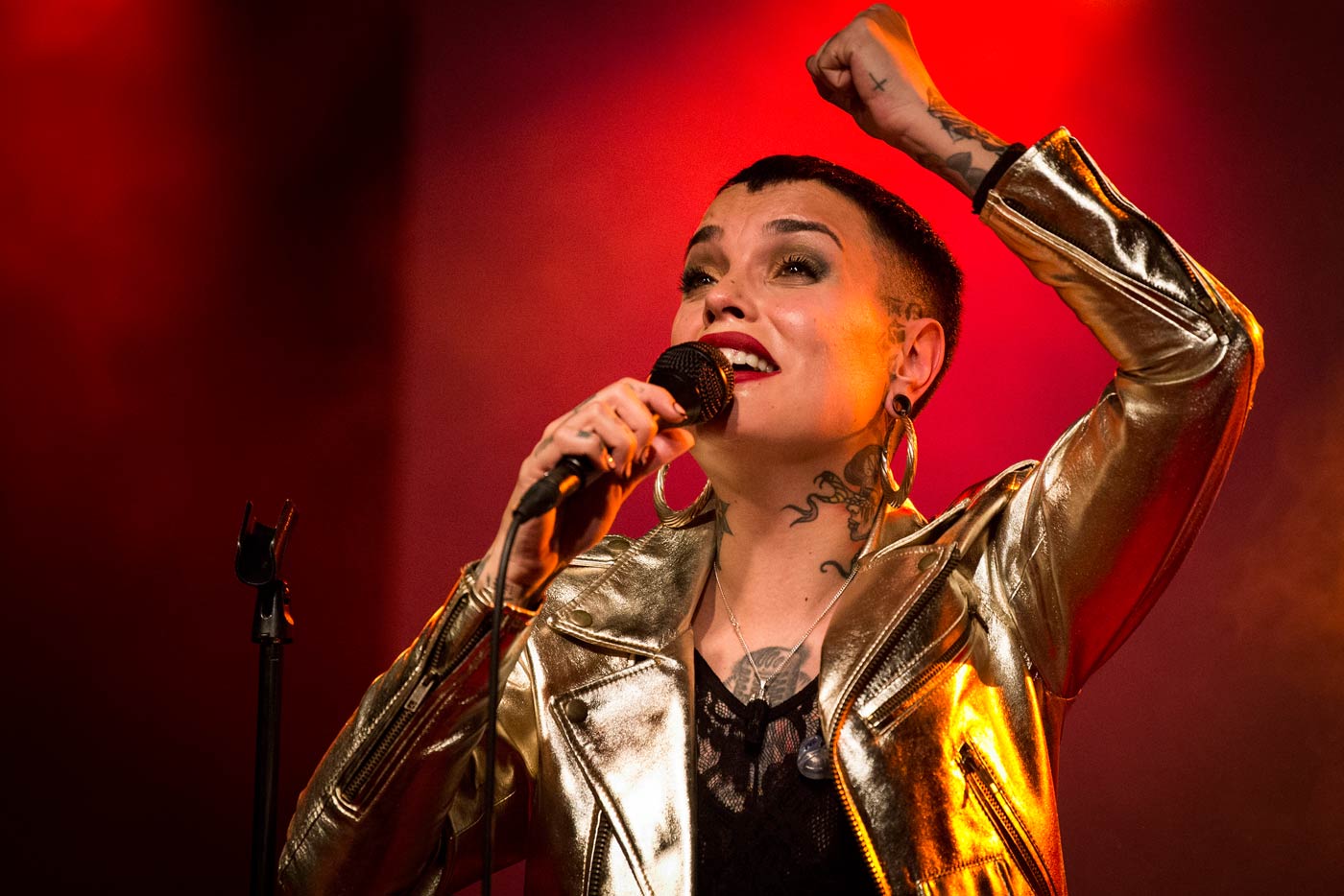 Dicho esto, hablemos de lo que nos compete. Con el apoyo de GPS (Girando por Salas), iniciativa que fomenta el intercambio cultural entre artistas y público de diferentes procedencias geográficas, y que en el caso concreto de la artista suma seis fechas a las ciudades que ya tenía en su agenda, la sala Jimmy Jazz de Vitoria-Gasteiz, el viernes 26 de Abril nos traía a la flamenca. Con la pista llena de féminas en su gran mayoría, a las 22:30 el huracán Irene irrumpía en la sala generando una adicción instantánea a la fragancia que segrega con cada movimiento. Con su aspecto de virgen de Guadalupe andaluza en tonos dorados, daba comienzo a la noche a través de un “Fuego” que sabía a café arábico, y ponía a tono a los adormilados. Ya ubicados en su hotel de 5 estrellas, nos llevaba a su tierra a través de una versión del tema “Todo es de color”, el cual comparten Triana, Smash y Manuel Molina, y que este último transformó dejando su sello en el flamenco más vanguardista. Sonaron entonces “El niño del velero”, y “Quiero decirte al oído”, en éste nos susurraba con entonación latina y tras él se despojaba del manto dejando ver su piel cubierta de encaje. Cambio de registro y estilo radical, como es ella, rock n roll tirando de uno de su trayectoria, “Ali baba”. Y momento vulnerable con “Luna lunera”, perdido entre la solemnidad flamenca y el más oscuro ritual, para dar paso al homónimo del disco que presenta en la gira; comentaba la artista que las mentiras estaban a la orden del día en el momento que vivimos. Parecía querer dar un giro de tuerca cuando nos deleitaba con uno de sus temas más sonados, “Electrify”, y nos retaba con “Ven y atrévete”, que seguía mostrando la misma mixtura de todas las canciones que componen el disco protagonista de la gira, pero con una letra claramente reivindicativa al feminismo. Curiosamente, después venía “I´ve got my eyes on you”, en el cual bájaba a la pista desconcertando a los técnicos de la sala.