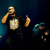 Para la ocasión se rodearon de la troupe de Rap Solo: el Señor Rojo abrió la noche, y las letras víricas de Xhelazz calentaban motores. A las diez y media salían a escena los maños entre pitidos y llamadas de un público ansioso. R de Rumba a los platos fue dando paso progresivo a escena a un Hate, Liriko y Kase O, protagonistas de una lírica implacable. En el repertorio les dio tiempo de sobra a agotar el “Vivir para contarlo” hasta la entraña, desde el corte que da título al disco a “Ocho líneas”, “Zombies”, “Alergia”, “No somos ciegos”, “Zombis”, “Asómate”, “Información planta calle” o una espectacular “Pura droga sin cortar”; de paso, repasaron una discografía repleta de auténticos hits que hicieron levantar los brazos a la audiencia: desde “El rey de las cantinas”, “Ballantines”, “Atrás” o “Máximo exponente”, hasta recuerdos de su primer compacto o piezas del disco de R de Rumba.