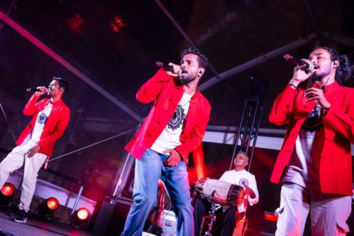Traslado a la Plaza San Jorge para ver a Ta Dhom Project. Tras este nombre se encuentra Viveick Rajagopalan, un músico con raíces en la música clásica de la India, pero con una visión mucho más amplia y moderna. Virtuoso del mrindagan, instrumento de percusión, ha compuesto múltiples bandas sonoras y tiene abiertos varios proyectos. Pero es con Ta Dhom Project que ha reunido, por primera vez en la India, ritmos clásicos carnáticos, beatbox, percusión vocal y rap callejero de la manera más singular. En el escenario tres raperos, un bajo y Viveick con su mrindagan conectado vía midi a un ordenador. Juntos dieron una especie de show y a la vez clase magistral de “konnakol”, el arte de interpretar sílabas de percusión vocalmente, que atrapó al atento público que abarrotaba la Plaza. Cuando acabaron lanzaron el mensaje de que: “por favor, el mundo deje de luchar por las fronteras”.