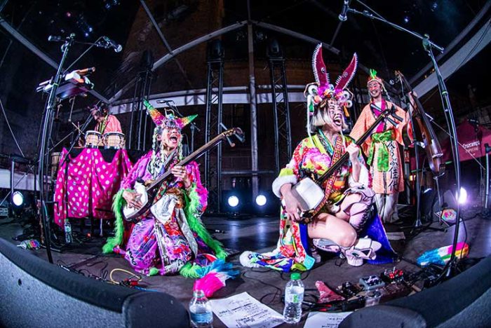 Paseo a la acogedora Plaza San Jorge para ver lo más exótico del festival, Mitsune. Trio femenino de shamisen (laúd japonés de tres cuerdas) afincado en Berlín con miembros de Japón, Australia y Alemania, y que en directo se acompañan de un contrabajista y un percusionista. De entrada, la imagen es sorprendente con trajes muy coloridos y con las caras maquilladas. Su repertorio se compuso de temas de sus dos discos, una mezcla de composiciones originales y de interpretaciones particulares de canciones tradicionales, pero con un sentido de la diversión, digamos que particular. Aunque de las tres componentes originales solo pudieron venir dos, por un tema maternal, su actuación no se resintió. Como ellas dijeron “la música es un lenguaje universal” y en Womad eso es una ley básica para un público que se lo pasó en grande con la extravagante banda.