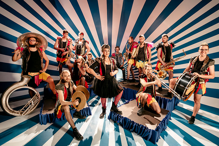 Les trajo a mi vida el “algorritmo” del teléfono. Apareció un vídeo en el que estaban en un pueblo con sus faldas, su estilismo, su estética y un sonidazo increíble. Estaban haciendo una versión de “Killing In The Name” de Rage Against The Machine, y tenían a gente de todas las edades bailando, saltando. Me encantó el rollo que tenían y la energía que transmitían. Así que les di a seguir, y más tarde pensamos en hacer un videoclip y una versión nueva de “Mi genética”. Yo quería hacerla con ellos, les propuse y me dijeron que sí. Nos encontramos en el estudio y allí nos conocimos realmente. De esos días de convivencia nace mi invitación a que nos acompañen en el último concierto de la gira del veinticinco aniversario en Granada. Vinieron, hicieron la primera parte del concierto, y luego se subieron a tocar los temas. No habíamos ensayado, a la que oían la frase se pegaban rápido: improvisaban, se hacían solos, se iban para el público… Fue un concierto increíble. A los pocos días recibí una llamada de Laita, el líder de la banda, y me propuso que hiciéramos unos cuantos conciertos juntos. Le dije que sí, que claro. Se lo comentamos a nuestro manager y al equipo: “¿Cómo presentamos esto? Hace falta que hagáis, aparte de la “charanga versión”, algún EP o unos temas”. Ahí nació la idea, por un lado, de aceptar esta invitación y agrandarla, pensando que si íbamos a tocar los temas de Amparanoia yo quería darles un nuevo concepto, estético y musical, que ya había sentido en toda la celebración del veinticinco aniversario que me lo estaba pidiendo el cuerpo. A todo esto ya llevaba tiempo trabajando en el estudio con mi segundo hijo, Mayito. Habíamos hecho muchas producciones juntos, yo tenía cositas grabadas con él y dije: “El cambio va a venir por la electrónica y por la fusión de artistas”. Ahí aparece el concepto de “Fan Fan Fanfarria”, el nombre del álbum, la estética de circo y musicalmente el concepto de tirar para los Balcanes, para Orleans, y también para las fiestas del pueblo y la charanga.