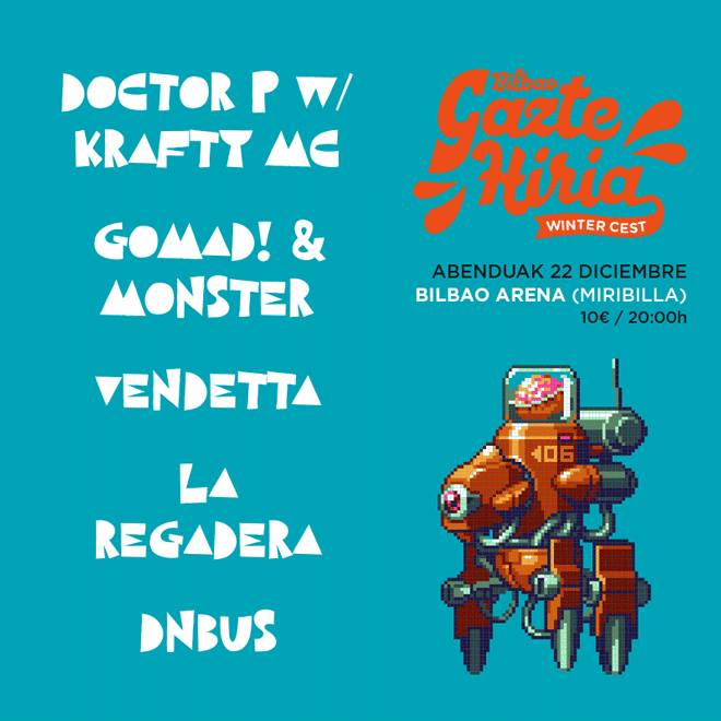 BILBAO GAZTE HIRIA Winter Cest es una superfiesta universitaria que se celebra en el Bilbao Arena el 22 de diciembre con las actuaciones de Vendetta, La Regadera, Gomad! & Monster, Doctor P w/ Krafty MC y Dnbus, entre otras formaciones.
