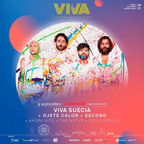 Para esta edición, desde las 18.30h de la tarde, y hasta bien entrada la madrugada, sobre el gran escenario del Viva se podría disfrutar de cuatro propuestas de la mejor pop y rock independiente en la que destaca la presencia de los murcianos Viva Suecia y Second y de los monarcas del subnopop, Ojete Calor. Además, los albaceteños The Niftys y Don Fluor y la banda de Castellón, Anora Kito completarán una tarde-noche inolvidable en el segundo día de la Feria de Albacete 2023.