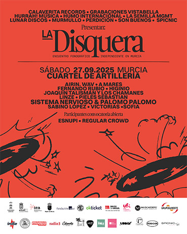 Murcia celebra el 27 de septiembre la edición cero de La Disquera, un nuevo encuentro fonográfico independiente en el Cuartel de Artillería impulsado por los sellos murcianos Hurrah!, Perdición, Grabaciones Vistabella, La Semilla y Son Buenos. Showcases, talleres y charlas nutren una programación gratuita que pretende consolidarse como escaparate de una escena murciana que aspira a ser industria.