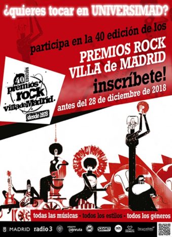 La inscripción para la 40ª edición de los Premios Rock Villa de Madrid estará abierta hasta el 28 de diciembre. La final la disputarán cinco finalistas durante el festival Universimad 2019 en el que también habrá importantes artistas invitados. En esta edición se repartirán 3.000 euros en premios, giras, festivales... Habrá un Premio AIE que premiará al mejor intérprete a participar en el programa "AIEnRUta" , Premio Sziget que dará la oportunidad de actuar en la edición 2019 en Budapest y Premio Creanauta.com que proporcionará a todos los finalistas un bono de distribución mundial de hasta un LP entre otros premios. Para más información e inscripción al concurso pincha aquí.