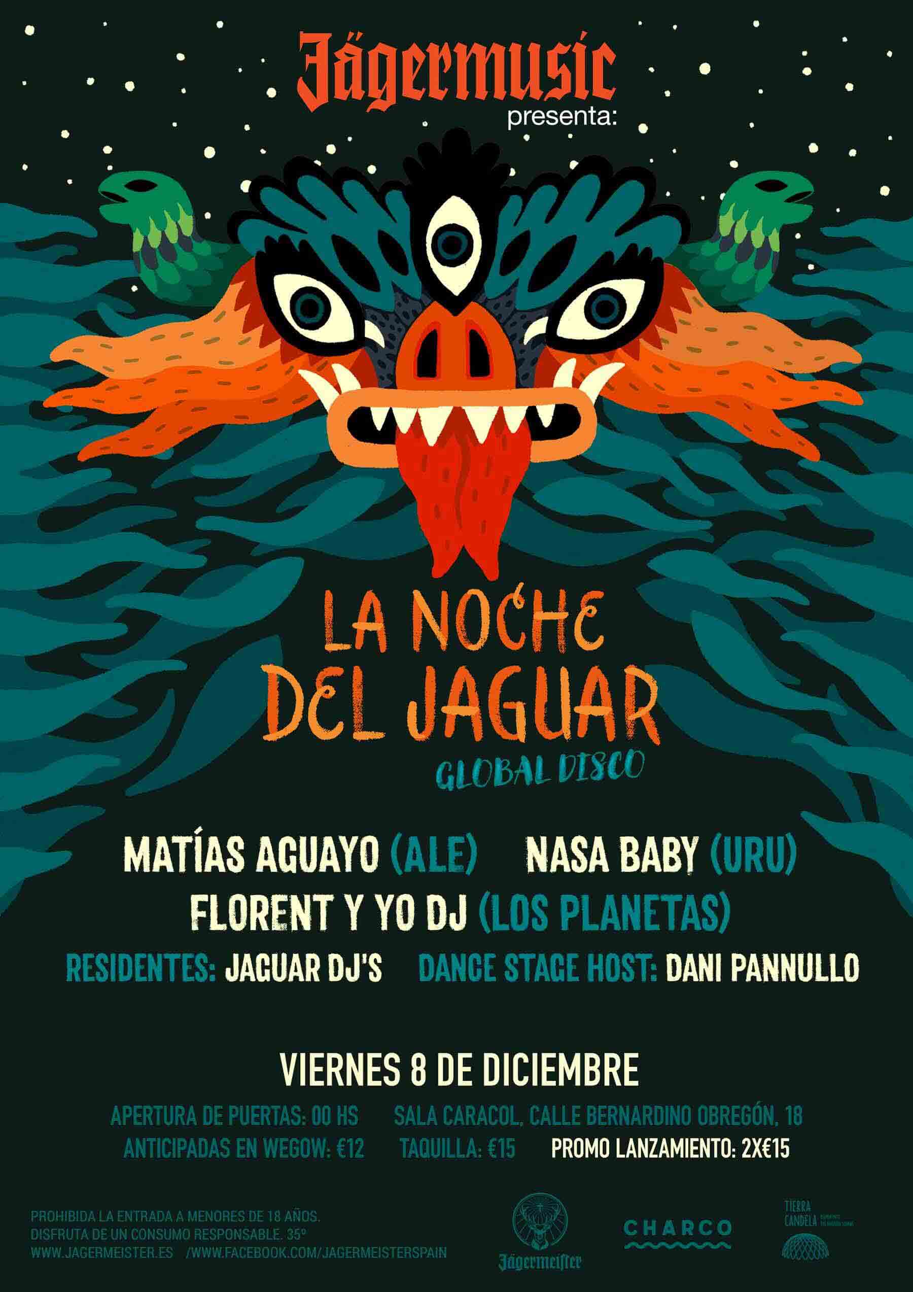El próximo viernes 8 de diciembre empieza la segunda temporada de "La Noche del Jaguar", con una programación completamente nueva, artistas internacionales y djs residentes que pasaran del global bass al dub, el disco, la cumbia, el funk o los balkan beats. La primera sesión empezará con el show del aclamado productor chileno-alemán Matías Aguayo, junto con el dj local Florent y yo de Los Planetas, el DJ uruguayo Nasa Baby y los residentes Jaguar DJs, en la Sala Caracol de Madrid. El año pasado, echando la vista atrás, hubo desde dj sets de Acid Arab, Mala Rodriguez y Otura Mun (líder de ÌFÉ) a conciertos de Zuco 103, Asian Dub Foundation y Meneo, así que el listón está alto.