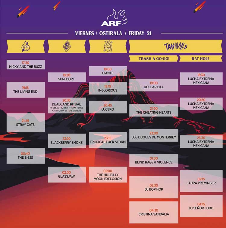 No nos podemos olvidar de la maravilla de espacio Trashville (dos carpas de madera) donde se sudará a base de rock'n'roll sucio y primitivo de la mano de bandas como Blind Rage & Violence, Los Torontos y Pussycat & The Dirty Johnsons, entre otras, junto a la lucha extrema mexicana que volverá tras triunfar en la edición 2017, y los pinchadiscos que alargarán la fiesta hasta prácticamente el amanecer.