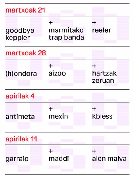 Ya conocemos los 12 proyectos seleccionados por el jurado profesional que actuarán en directo en uno de los 4 conciertos a celebrar en Bilborock en los días 21 y 28 de marzo, y 4 y 11 de abril. VillaSoundBilbao es un programa del ámbito musical, promovido por el Ayuntamiento de Bilbao, para que solistas y grupos jóvenes (entre 16 y 35 años) de Euskadi y Nafarroa reciban un impulso en su carrera profesional y acerquen al público el panorama musical actual. Las bandas seleccionadas por un jurado profesional han sido Goodbye Keppler, Marmitako Trap Banda y Reeler (actuarán el 21 de marzo); (h)ondora, Aizoo y Hartzak Zeruan (actuarán el 28 de marzo); Antimeta, Mexin y Kbless (actuarán el 4 de abril); y Garraio, Maddi y Alen Malva (actuarán el 11 de abril).