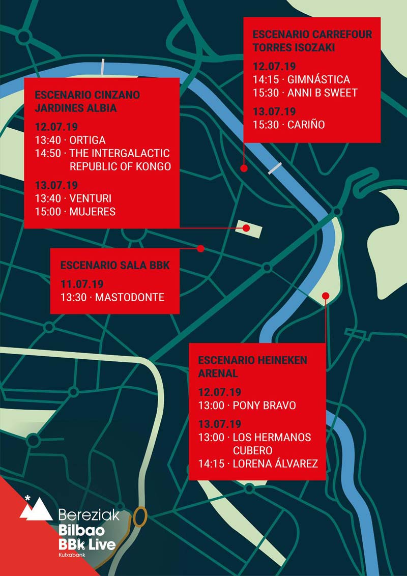 Como viene siendo habitual en los últimos años, Bilbao BBK Live bajará desde Kobetamendi hasta el centro de la ciudad para ofrecer una variada programación de conciertos para todos los públicos durante los días de celebración del festival. Las prácticamente una docena de actuaciones estarán repartidas en 4 escenarios: Torres Isozaki Carrefour, Jardines de Albia Cinzano, Arenal Heineken y el escenario frente a la Sala BBK en la Gran Vía.