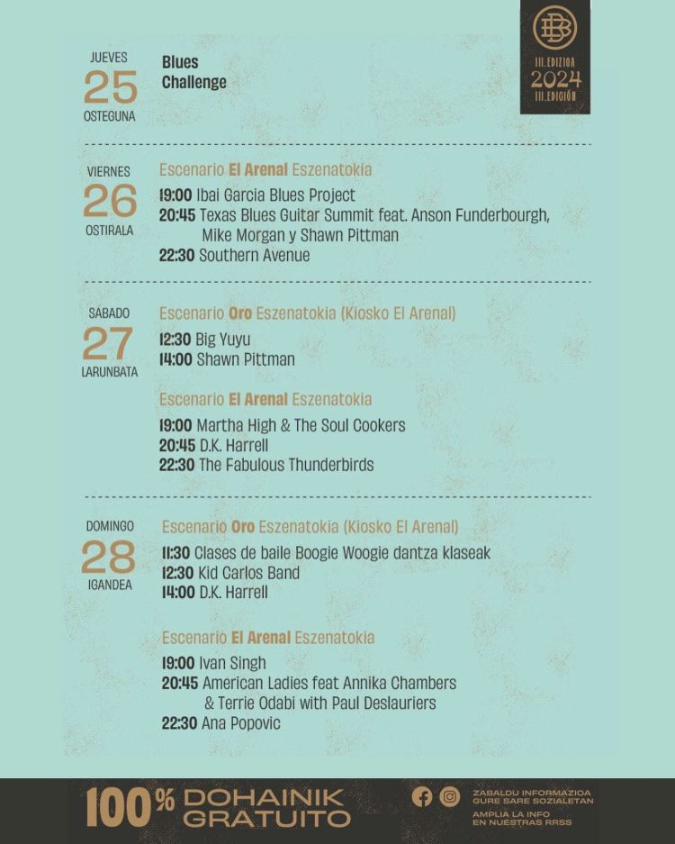 Bilbao Blues Festival volverá a finales de julio, del 25 al 28 de julio, para animar el verano de la capital vizcaína. Durante cuatro jornadas el blues inundará el corazón de la ciudad con jugosas actuaciones gratuitas para todos los públicos. Acaba de completar el cartel de su tercera edición su con las incorporaciones de Southern Avenue, Annika Chambers, Terrie Odabi, Ivan Singh, Kid Carlos Band e Ibai García Blues Project. Estos artistas se unen a las bandas y solistas ya confirmados: The Fabulous Thunderbirds, D.K. Harrell, Ana Popovic, Big Yuyu, Martha High & The Soul Cookers, Anson Funderburgh, Mike Morgan y Shawn Pittman.