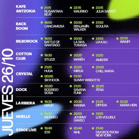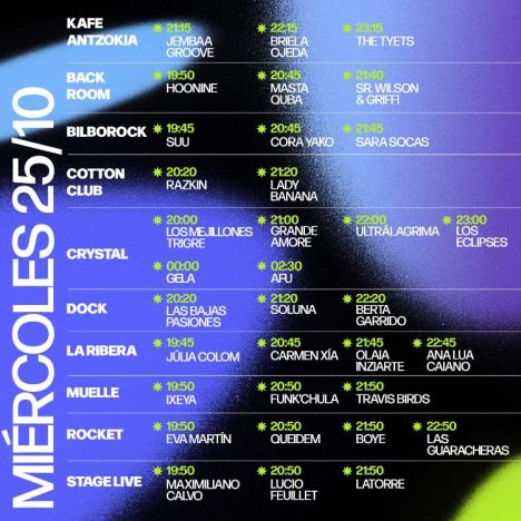 BIME LIVE tendrá lugar en diferentes puntos de la ciudad del 25, al 28 de octubre. Diez salas y dos espacios al aire libre serán los encargados de acoger más de 90 showcases, conciertos y DJ sets, todos ellos gratuitos, que mostrarán los talentos del futuro y las propuestas más vanguardistas del momento de América Latina, Europa y España. El miércoles 25 y el jueves 26, los showcases se distribuirán en: Kafe Antzokia, Back Room, Bilborock, Cotton Club, Crystal, Dock, La Ribera, Muelle, Rocket y Stage Live; el viernes 27, Crystal, Bilborock, y de nuevo Kafe Antzokia, donde habrá una edición especial de Stereorocks Club, con las actuaciones de lxs DJs Celia Carrera, Paul Larrozea y Hugo, seleccionados de las convocatoria BIME x Stereorocks. El sábado 28 será el turno de los conciertos al aire libre en dos ubicaciones de la ciudad, el Parque de Doña Casilda, y las canchas de baloncesto junto al Palacio Euskalduna.