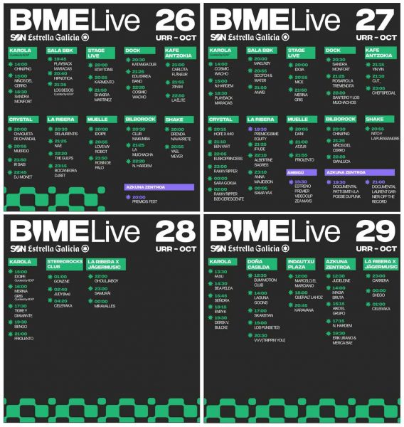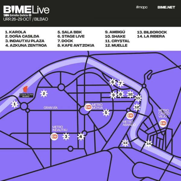 Este año, BIME Live se extiende por toda la ciudad, ni más ni menos que por 15 escenarios situados en distintas salas y en plena calle. El público de la ciudad podrá disfrutar de las actuaciones de artistas llegados de todas partes del mundo, con propuestas eclécticas y vanguardistas de acceso libre y gratuito, hasta completar aforo. Estos son los lugares donde se podrá disfrutar de propuestas de toda clase de estilos como el flamenco, pop, rap, trap, reggaeton, indie, reggae, alternativo, R&B, folklore, hardcore, hyperpop y electrónica: Azkuna Zentroa x Radio 3 (Judeline, Magia Bruta, Aiko El Grupo, N.Hardem y Erik Urano & Merca Bae, además del documental de Laurent Garnier y Patti Smith en colaboración con Filmin, y la celebración de los Premios Fest), La Ribera x Jagermusic (1ª edición de los PREMIOS BIME EQUITY y los conciertos de Delaurentis, Naë, The Gulps, Bocanegra, Ifiude, Albertine Sagres, Anna Majidson, Sama Yax, Ghouljaboy,Samuräi y Miravalles), Karola x Kexp (Chini.Png, Niñlos del Cerro, Sandra Monfort, Cosmic Wacho, N. Harden, Playback Maracas, Faxu, Bea Pelea, Señora, Enry-K y Derek V. Bulcke), Crystal (Chaqueta de Chándal, Muerdo, Ir Sais, DJ Monet, Hofe X4:40, Ben Yart, Euskoprincess, Rakky Ripper, Sara Goxua y B2B Cerescente), Muelle ( Idoipe, Love My Robot, Rosin de Palo, Dani, Atzur, friolento ), Bilborock (Club Makumba, La Muchacha, N.Hardem, Chini.Png, Niños del Cerro, Gianluca), Shake (Brenda Navarrete, Yael Meyer, Nito y Lapurasangre), Stage Live (Staytons, Karmento y Shakira Martínez), Dock (Katanga Dub, Edu Errea Band, Cosmic Wacho, Sandra Monfort, Rosario La Tremendita y Santero y Los Muchachos), Kafe Antzokia (Yin Yin, Cut_, Chef'special, Carlota Flaneur, 31FAM y La Élite), Ambigú (Estreno videoclip Zea Mays), Sala BBK (Playback Maracas, Hipnotica, Los Besos, Anaïs, Scotch & Water, Maelføy), Stereorocks (Gonz.Ne, Judy y Celeraka) y los escenarios al aire libre en el Parque Doña Casilda y Plaza Indautxu (Bum Motion Club, Laguna Goons, Skakeitan, Los Punsetes, VVV [Trippin you], Marcelino, El Marciano, Queralt Lahoz y Karavana)