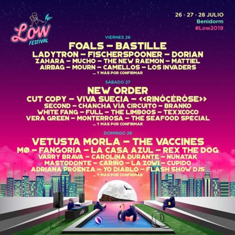 Con un cartel todavía sin cerrar, Low Festival 2019 ha dado a conocer su cartel por días. Para esta 11ª edición, el festival ha confirmado a 44 de los más de 60 artistas que conformarán tres días y 36 horas de música en directo. Entre la programación encontramos a grupos como Foals y Bastille, quiénes estarán el viernes 26 en el recinto de la Ciudad Deportiva Guillermo Amor junto a Dorian o Zahara entre muchos otros. El sábado 27 será el turno de New Order, Cut Copy o <<Rinôçérôse>> mientras que Vetusta Morla, The Vaccines, Carolina Durante o Cupido estarán en la jornada de cierre el domingo 28. En las próximas semanas el festival dará a conocer los nombres que cerrarán el cartel. Se trata de artistas de diferentes géneros como el indie, pop, rock, electrónica, trap, garaje e incluso cumbia.