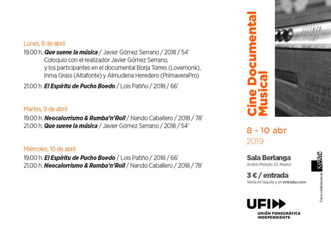 Cine Documental Musical es la apuesta de la Fundación SGAE por los documentales de naturaleza y temática musical. Contando con la colaboración de la Unión Fonográfica Independiente (UFI), el ciclo de largometraje cuenta con tres títulos. Que suene la música es una producción propia de la UFI que relata las relaciones entre sellos y artistas incluyendo entrevistas a personalidades del sector. Además contará con un coloquio de presentación con el realizador y varios protagonistas. Otro de los títulos es O espiritú de Pucho Boedo que cuenta las peripecias de Novedades Carminha en el barrio sevillano de La Mina mientras grababan su último trabajo. Por su parte el último título, Neocalorrismo & Rumba 'n' Roll, se centra en un artista emancipado de las reglas que crea fusionando, mezclando y colisionando estilos.