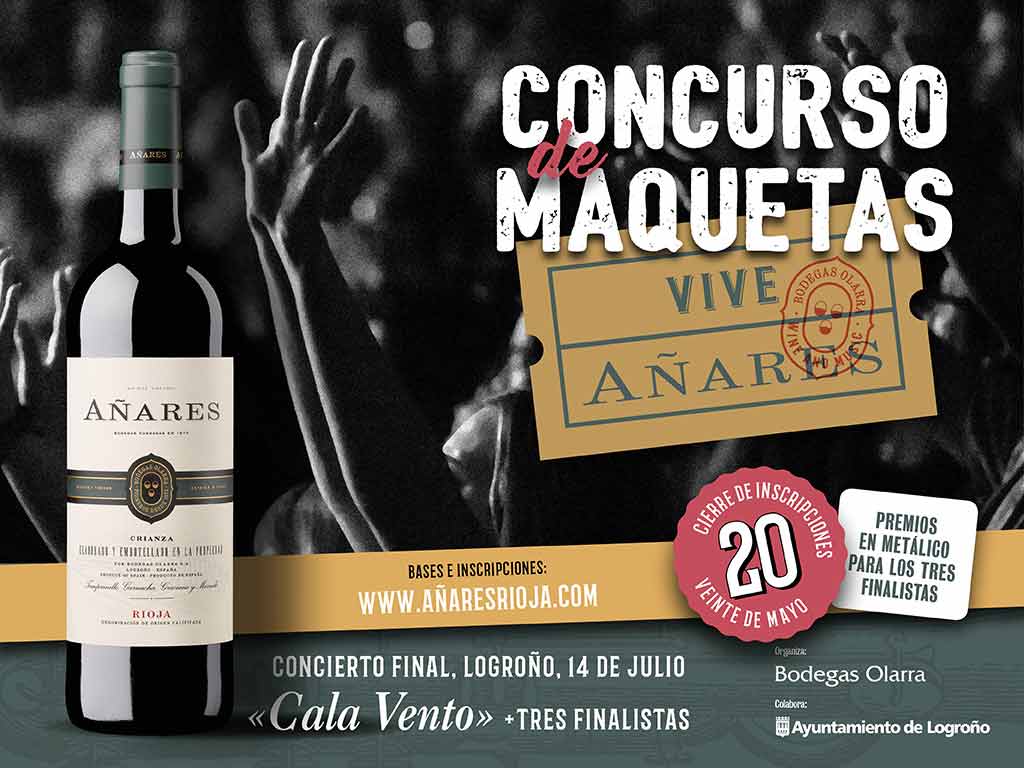La primera edición del Concurso Musical “Vive Añares” desarrollado por Bodegas Olarra, en colaboración con el Ayuntamiento de Logroño, se encuentra en fase de inscripciones y los interesados en participar en su primera edición podrán enviar sus propuestas hasta el día 20 de mayo. El certamen, cuyo objetivo consiste en promover el desarrollo del talento y creación artística en el ámbito musical, permite participar a los artistas, grupos o solistas con residencia en el Estado y cuyos integrantes cuenten con una edad entre 18 y 35 años y sin álbum publicado (a excepción de los autoeditados o aquellos que no hayan firmado contrato discográfico ni editorial).