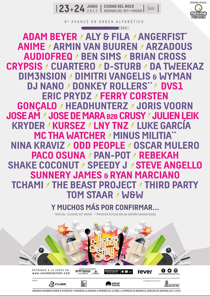 Esta nueva tanda de confirmaciones llega encabezada por el dj holandés Armin Van Buuren, quien cerró la primera edición del festival en 2015. También repite Joris Voorn y Dj Nano, quien no ha faltado en ninguna de las tres ediciones. El techno actual internacional lo traerá Speedy J, además del característico sonido house del proyecto formado por Tassilo Ippenberger y Thomas Benedix, aka Pan-Pot. Se encargarán del hard los nacionales The Beast Project mientras que el internacional será cosa de Donkey Rollers. EDM, techno, hard, progressive y trance se darán cita en dos jornadas consecutivas el 23 y 24 de junio en La Ciudad del Rock de Arganda del Rey (Madrid). Las entradas ya están disponibles a partir de 50€. Sumándose a los ya anunciados el cartel se queda así por ahora: