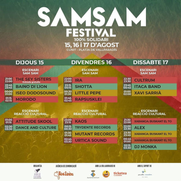 El Sam Sam, organizado por la asociación Reacció Cultural en colaboración con Amics d’en Ferran, es de ese grupo de festivales que se conciben a sí mismos como medios y no como fines. En este caso, hablamos de un festival sin ánimo de lucro que pretende poner la solidaridad en el centro y cuyos beneficios irán destinados a un proyecto educativo realizado en la escuela Kalasans del barrio senegalés de Sam Sam, en Dakar (Senegal). Tal y como explican, tratan de construir "un espacio de transformación social lleno de música y actividades para todos los públicos donde se cree en la cultura como una herramienta de cambio".