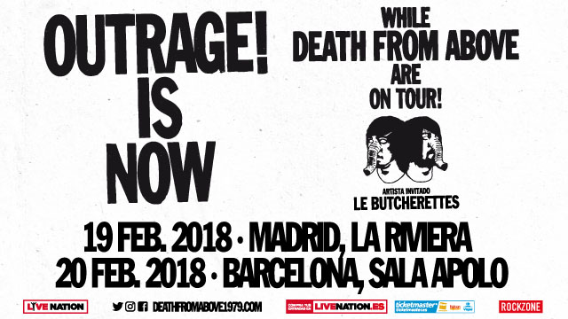 El pasado martes, Death From Above confirmaban dos fechas en nuestro país, en las que presentarán su nuevo disco “Outrage! Is Now” (Last Gang, 17), publicado el 8 de septiembre. Los conciertos serán el 19 de febrero en La Riviera de Madrid y el 20 de febrero en la Sala Apolo de Barcelona. Además, contarán como teloneros con Le Butcherettes, la banda de garaje-punk liderada por Teri Gender Bender, que estuvieron por última vez en España el otoño pasado presentando su tercer LP, “A Raw Youth” (2015).
