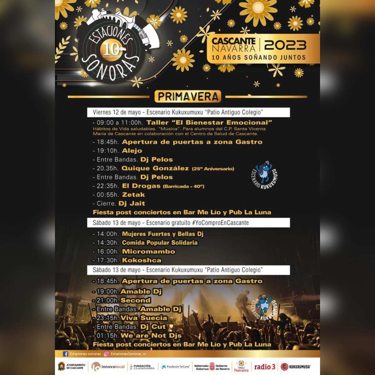 El ciclo musical celebra su edición de primavera los días 12 y 13 de mayo en Cascante en el año de su décimo aniversario. El festival navarro es, sin duda, uno de los más activos, con sus cuatro ediciones al año repartidas entre las estaciones. La primera jornada arrancará con El Drogas, en su gira de celebración del 40 aniversario de Barricada, y Quique González, repasando su último disco. Junto a ellos, compartirán escenario los músicos navarros Alejo y Zetak, este último poniendo el broche electrónico para finalizar la noche.