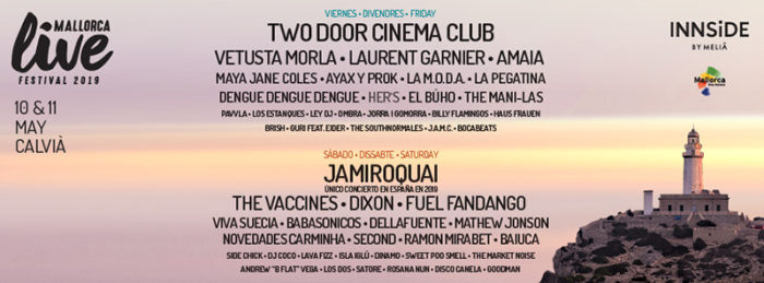 Parece que el Mallorca Live Festival ha cambiado el verano de fecha abriendo así la temporada de los festivales de verano. El Antiguo Aquapark de Calvià acogerá esta nueva edición del festival mallorquín durante los días 10 y 11 de mayo. Por estos escenarios pasarán este fin de semana artistas muy variados tanto estatales como internacionales. En lo alto del cartel encontramos grupos y artistas como Two Door Cinema Club, Vetusta Morla, The Vaccines, Laurent Garnier, Amaia y Jamiroquai que será el único concierto que den en España en 2019. También se sumó a este cartel el ganador del Mallorca Live Talent Andrew "B Flat", el rapero que además es productor y autor de sus propias bases.