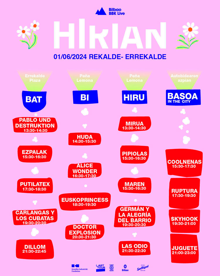 La programación festiva de Hirian llega una vez más como adelanto de Bilbao BBK Live. El festival, por su parte, se celebrará los días 11, 12 y 13 de julio en Kobetamendi y las entradas de día, bonos y plazas de camping ya están a la venta en bilbaobbklive.com.Hirian Horarios