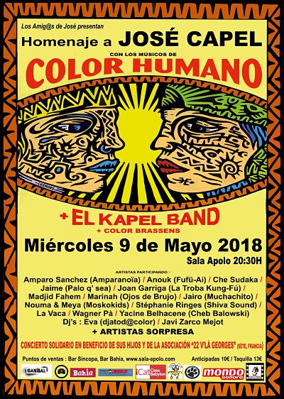Será una noche para celebrar sus múltiples facetas, musical, artística y como activista en movimientos asociativos. Actuarán los músicos de tres de las bandas de José Capel: Color Humano, El Kapel y Color Brassens, acompañados de Amparo Sánchez (Amparanoia), Anouk (Fufü-Ai), Che Sudaka, Jaime (Palo q’sea), Muchachito, Joan Garriga (La Troba Kung-Fú), Madjid Fahem, Marinah (Ojos de Brujo), Nouma & Meya (Moskokids), Stefanie Ringes, La Vaca, Yacine Belahcene (Cheb Balowski), Wagner Pà, djs Eva y Javi Zarco y más artistas sorpresa.
