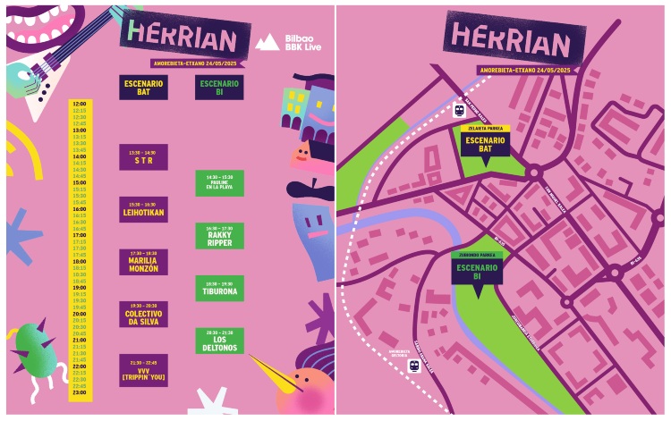 El aperitivo del festival Bilbao BBK Live que lleva la esencia del festival a diferentes municipios de Bizkaia, Herrian, celebra su segunda cita en Amorebieta-Etxano este sábado 24 de mayo. La cita reunirá a nueve artistas de la escena nacional y local, una programación diurna de acceso libre desde las 13h hasta las 23h en dos escenarios repartidos por la localidad: Zelaieta Parkea y Zubiondo Parkea. La jornada arrancará con la explosiva mezcla de electrónica y actitud punk de S T R y del dúo asturiano de pop íntimo y literario Pauline en la Playa. Después, referentes del punk euskaldún como Leihotikan, la pionera del hyperpop en español Rakky Ripper, Marilia Monzón y el trío madrileño Tiburona. El punto festivo y colorido de la jornada lo pondrán Colectivo Da Silva presentando su nuevo álbum por primera vez en Euskal Herria, la banda del rock de raíces en castellano Los Deltonos y una de las propuestas más sólidas del post punk electrónico estatal: VVV [Trippin’ You].