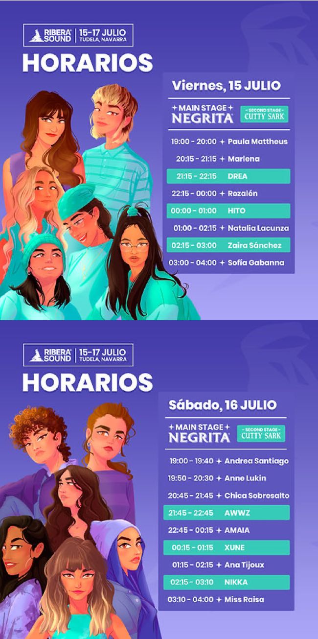 Ribera Sound, que se celebra los días 15, 16 y 17 de julio en Tudela, es el primer festival de gran formato que apuesta por un cartel 100% de artistas femeninas, con el objetivo de visibilizar, reconocer y ensalzar su indiscutible calidad musical dentro de una escena que todavía acusa una gran desigualdad. Amaia, Rozalén, Natalia Lacunza, Ana Tijoux, Sofía Gabanna, Marlena, Chica Sobresalto, María Blaya, Miss Raisa, Paula Mattheus, Andrea Santiago o Anne Lukin, entre otras, conforman un cartel variado donde también hay espacio para DJs y productoras de referencia en el circuito como AWWZ, Cristina Casado, Drea, Hito, Nikka, Xune y Zaira Sánchez. Así mismo, destaca la apuesta en esta edición por el talento local con un porcentaje del 50% de artistas navarras.