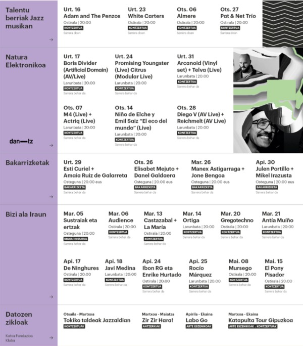 La programación musical vuelve a moverse entre la exploración y las raíces; el ciclo Natura Elektronikoa, en colaboración con Dantz, indaga en los cruces entre naturaleza y electrónica con artistas como Boris Divider, Niño de Elche, Arcanoid, M4 o Promising Youngster; "Bizi ala Iraun", uno de los ciclos más emblemáticos, celebra su cuarta edición revisitando el folk desde lenguajes contemporáneos con nombres como Rocío Márquez, Mursego, Audience, Antía Muíño, Ortiga, Castazabal, Ibon RG & Enrike Hurtado o El Pony Pisador. El jazz también ocupa un lugar central, tanto con "Nuevos Talentos del Jazz", en colaboración con Musikene, como con el ciclo previo al Jazzaldia, dedicado a bandas locales emergentes.