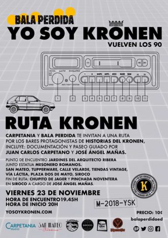 Esta semana de literatura y música de los noventa dará comienzo el lunes 19 de noviembre y finalizará el viernes 23 de noviembre. Para abrir esta semana "Yo Soy Kronen", el autor de la obra José Ángel Mañas estará en la Biblioteca Histórica de la Universidad Complutense de Madrid junto con Maica Rivera y Luis Mancha. El martes se hará un visionado en el Bar Pic-Nic de Mensaka, película de Salvador García Ruiz basada en la novela de José Ángel Mañas. Después del visionado, habrá un coloquio con el director y los actores de la película y con el autor de la novela. El martes también habrá una lectura poética en el bar Horacio. No podía faltar un evento musical en esta semana cultural y viene de la mano de Sobrinus y Chimo Bayo. Este concierto será el miércoles en la Sala Sol y puedes adquirir tus entradas en Wegow. También se podrá comprar una entrada que incluye un ejemplar de "Historias de Kronen". DosJotas, artista urbano, estará el jueves en un espacio de Malasaña aun sin anunciar. El jueves habrá también un coloquio de música de los noventa con Fran Nixon en Casa Filete. Para poner el broche final a esta semana, se hará una ruta Kronen en la que Carpetania organiza una ruta por los bares que aparecen en el libro como Vía Láctea, San Mateo Circus... Esta ruta acabará en la sala Siroco con una pinchada noventera de la mano del autor. Compra tus entradas en Carpetania.