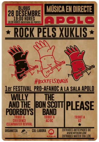 El Xuklis Festival se ha convertido en un evento cultural de calidad para los amantes de la música. Con él, la asociación pretende recaudar fondos para que sus actividades puedan seguir siendo completamente gratutias. Se pretende, al mismo tiempo, difundir y dar a conocer el proyecto y el trabajo que dicha entidad lleva a cabo. Las entradas anticipadas ya se pueden adquirir por 8€, aunque habrá más en taquilla por 12€. Actuarán en el festival Willy and the Poorboys, The Bon Scott band y Please, que harán versiones de Creedence Clearwater Revival, AC/DC y U2 respectivamente. El evento comenzará a las 19h, aunque la apertura de puertas será a partir de las 18:30h.