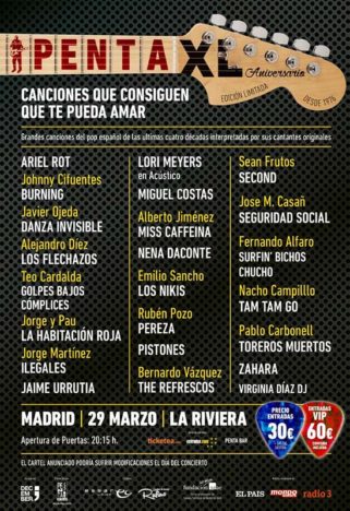 Con Lori Meyers se completa el cartel de Penta XL Aniversario, que reúne en una misma noche a más de veinte artistas: Ariel Rot, Johnny (Burning), Javier Ojeda (Danza Invisible), Teo (Golpes Bajos y Cómplices), Jorge Martínez (Ilegales), Jaime Urrutia, Jorge y Pau (La Habitación Roja), Alejandro Díez (Los Flechazos), Emilio Sancho (Los Nikis), Miguel Costas, Alberto Jiménez (Miss Caffeina), Nena Daconte, Rubén Pozo (Pereza), Pistones, Bernardo (The Refrescos), Sean Frutos (Second), Jose M. Casañ (Seguridad Social), Fernando Alfaro (Surfin' Bichos), Nacho Campillo (Tam Tam Go), Pablo Carbonell (Toreros Muertos), Zahara y a Virginia Díaz DJ.