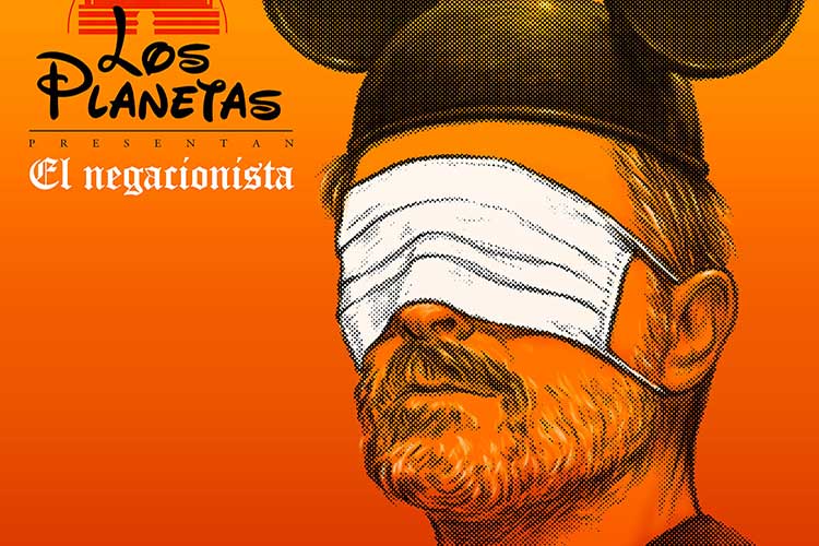 Así, “El Negacionista” combinará crítica dura y humor, pero tendremos que esperar un par de días para poder escucharla. Eso sí, la portada diseñada por el mismísimo Javier Aramburu una vez más es francamente reveladora. Podemos ver a un artista muy parecido a Miguel Bosé –uno de los grandes negacionistas recientes en nuestro país– ataviado con orejas de Mickey Mouse y con una tipografía que nos recuerda a las obras de Walt Disney.