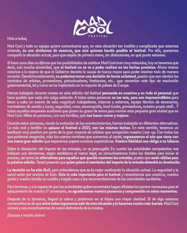El Mad Cool informa oficialmente de que no va a poder celebrarse dentro de las fechas previstas, por la actual crisis del Coronavirus y las restricciones para actos públicos y con tanta gente. Debido a ello, la organización ha estado trabajando en opciones diversas, aunque argumentan que la más sólida sería celebrar el festival en unas fechas similares de 2021.