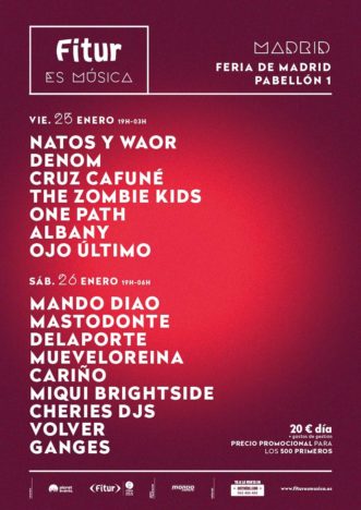 Los días 25 y 26 de enero llega a Madrid una nueva apuesta cultural dentro del marco de celebraciones de Fitur Festivales en IFEMA: "Fitur es Música", una programación de conciertos para estos dos días en los que destacada la paridad y el eclecticismo de su cartel, organizado por Planet Events, IFEMA y Fitur. El primer día, de 19h a 3.00h, la temática es el rap y el trap, con los siguientes artistas confirmados: Natos y Waor, Denom, Cruz Cafuné, The Zombie Kids, One Path, Albany y Ojo Último. El segundo día, de 19h a 6.00h, la programación será indie y electrónica: Mando Diao, Mastodonte, Delaporte, Mueveloreina, Cariño, Miqui Brightside, Cheries DJs, Volver y Ganges.