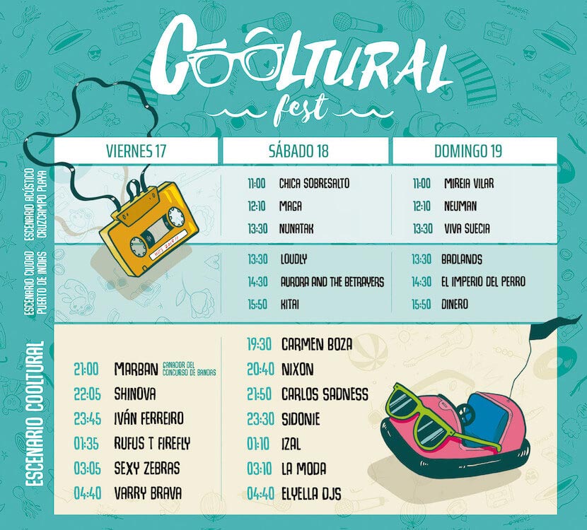 Programa apretado el que depara este fin de semana el Cooltural Fest. La cita almeriense propone más de una veintena de conciertos repartidos por tres escenarios diferentes de la ciudad. Iván Ferreiro encabeza la jornada del 17 de agosto mientras que Izal lo hará el sábado 19. Además del escenario principal situado en el Recinto Ferial de Almería destacan los otros dos escenarios que funcionarán el sábado y domingo: Uno situado en la Playa de las Palmeras (Escenario Acústico Cruzcampo Playa) con acústicos matutinos el desde las 11 de la mañana y otro a la hora de las cañas en pleno Paseo y coincidiendo con la feria de día almeriense (Escenario Ciudad Puerto de Indias). Aquí os dejamos todos los horarios para que os podáis organizar este fin de semana de música y vacaciones.