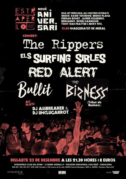 Hablamos de The Rippers (que van a perder a su bajista David Teichenné), Els Surfing Sirles (donde tocaba Uri Caballero, muerto a los 34 años), Bullitt (formación de hardcore melódico donde tocaba el bajo Ferran Bonet, también miembro de Without), The Biznezz (grupo tributo a la banda de punk The Business, que perdió a su frontman Micky Fitz en 2016) y Red Alert (su bajista fue Tony Van Fratter, también de Cockney Rejects, que murió en 2015). También se homenajeará a Dickie Hammond (guitarrista de Leatherface, fallecido en 2015), el cantante Bernardo y el promotor de conciertos barcelonés Javier Ezquerro. Completaran la noche los Dj’s Assbreaker y Unclugarrot. Antes de todo, la Estraperlo inaugurará también un mural en memoria de todos los colaboradores. Las entradas se podrán comprar por 8 euros.