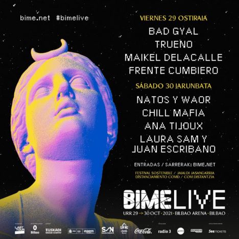 En cuanto a la músisca en directo, llegará a través de dos vías: el festival BIME Live tendrá lugar los días 29 y 30 de octubre en el Bilbao Arena con un cartel formado por Natos y Waor, Bad Gyal, Trueno, Ana Tijoux, Chill Mafia, Maikel Delacalle, Frente Cumbiero y Laura Sam & Juan Escribano; y en los días previos, BIME City nos presentará las últimas tendencias musicales del panorama local, europeo y latinoamericano en distintas salas de la capital vizcaína. Serán más de cuarenta artistas emergentes de distintos países: Ruiseñora, Ferran Palau, Pinpilinpussies, Whesphere, Marta Knight, Magalí Sare & Malen Fortià, Monzi Sez, Xisco Feijoo, Allova, Ibil Bedi, Malaiierba, Alberto & García...