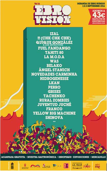 Se suman a los previamente confirmados, entre los que estaban nombres como Izal, !!! (chk chk chk), Quique González, Fuel Fandango, Tahiti 80 o La M.O.D.A.. Para la decimosexta edición del Festival Ebrovisión habrá una gran muestra gastronómica, Ebropeque, exposiciones, mercadillo, conciertos gratuitos distribuidos por toda la ciudad, sesiones de Dj´s en los lugares más insospechados y muchas más sorpresas.