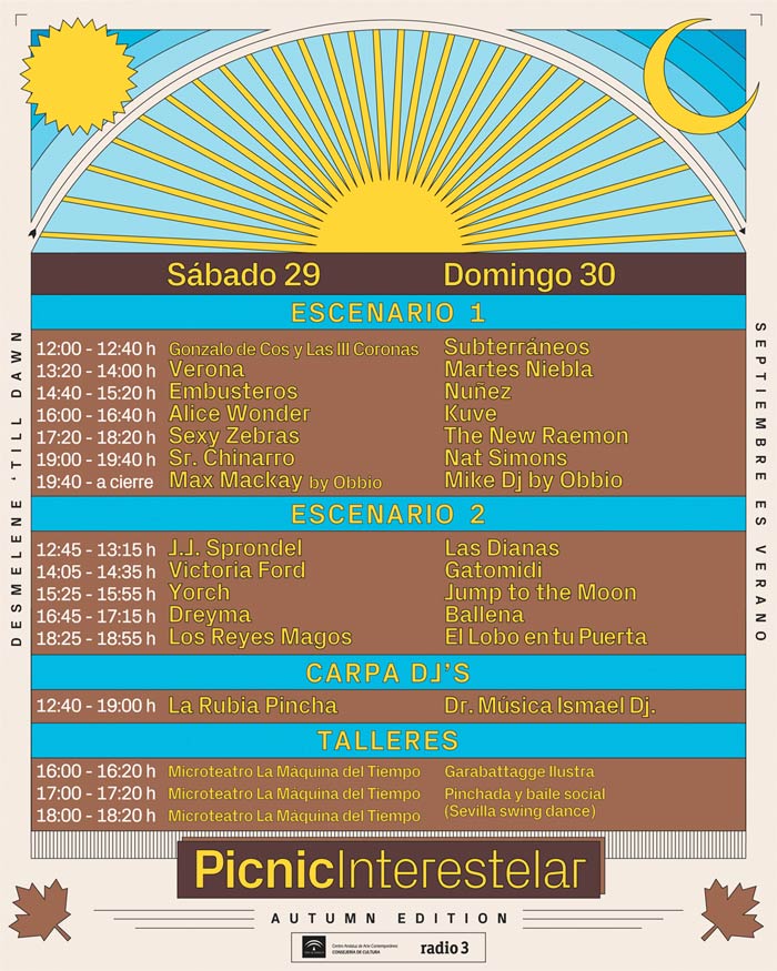 El sol del membrillo, un espacio abierto como los jardines del CAAC y un montón de conciertos y actividades para grandes y pequeños son excusa suficiente para dar la bienvenida al nuevo solsticio antes de que nos cambien la hora. El hermano pequeño del festival Interestelar de Sevilla busca resarcirse de la suspensión en primavera y presenta un cartel plagado de frutos de otoño. Propuestas puramente de la estación como Sr. Chinarro, The New Raemon, Nat Simons o Alice Wonder y también efluvios del verano que acabamos de despedir como Sexy Zebras, El Lobo en tu puerta o Ballena. Y es que el menú del Picnic es variado y apto para picar de todo un poco, tienes chips como Jump To The Moon, carbohidratos como Embusteros o Kuve y también algo picante como Subterráneos y para beber el pop rock destilado de Verona y JJ Sprondel. A escasos metros del Centro Andaluz de Arte Contemporáneo no podía faltar un referente de vanguardia como son Dreyma. Un total de veinte bandas a las que se suman las sesiones de La Rubia Pincha o Dr. Música Ismael, exhibiciones de baile, teatro y zona infantil con castillos hinchables y por supuesto zonas de restauración donde gastar lo que te has ahorrado en la entrada, porque es gratuita. Que caigan las hojas, viva el otoño.
