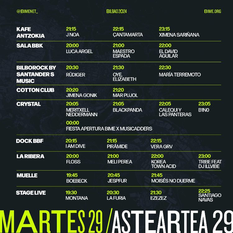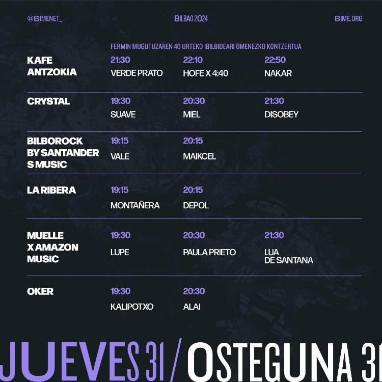 BIME Live también completa su oferta de actividades culturales abiertas a la ciudadanía con el concierto homenaje a los 40 años de trayectoria de Fermín Muguruza en el Kafé Antzokia el día 31 de octubre. Un evento en el que, con la colaboración de Izar & Star, lxs artistas HOFE x 4.40, Nakar y Verde Prato, reinterpretarán piezas míticas de Fermín Muguruza -desde Kortatu hasta la actualidad, pasando por Negu Gorriak. Habrá también una edición especial de Stereorocks Club con las actuaciones de lxs DJs Bendiak, Aitana Rodríguez y J-3Ø3. Además, la iglesia de la Encarnación tendrá una sesión especial de Candlelight: Tributo a Ludovico Einaudi; promovida por Fever.