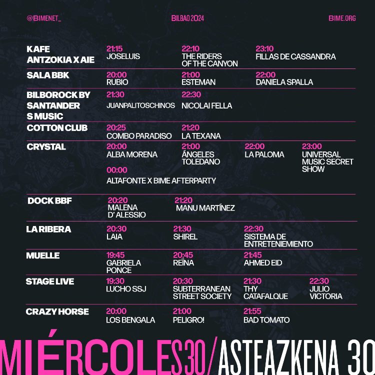 En la parcela musical, desde hoy 29 de octubre hasta el día 31 de octubre, las principales salas del centro de la ciudad, Kafe Antzokia, Bilborock by Santander S Music, Sala BBK, Stage Live, Crystal, La Ribera, Muelle, Cotton Club, Dock BBF, Crazy Horse, y Oker, acogerán más de noventa showcases, conciertos y dj sets, perfectos para que profesionales acreditados y ciudadanía conozcan las propuestas más vanguardistas del momento de Iberoamérica y Europa (con aforo limitado y prioridad para profesionales acreditados). Al cartel ya anunciado el pasado mes de septiembre se unen nuevos nombres como las promesas de la música gallega Fillas de Cassandra (ES); la banda de noise rock La Paloma (ES); los ritmos funk brasileños de Lua de Santana (BR/ES); el rapero argentino conocido por su paso por el Quinto Escalón Lucho SSJ (AR); el joven artista bilbaíno Suave (ES), o el artista catalán Depol (ES).