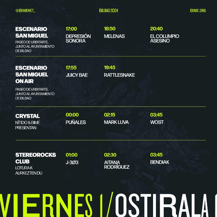 El día 1 de noviembre será el turno de la música al aire libre con dos escenarios, San Miguel, y San Miguel On Air, situados en el Paseo de Uribitarte, junto al Ayuntamiento de Bilbao, y que acogerán las actuaciones de bandas y artistas como Depresión Sonora (ES); con su crudo post-punk; El Columpio Asesino (ES), una de las bandas más influyentes del pop nacional, o la cantante de trap, rap y R&B Juicy Bae (ES), entre otrxs. Además, tras estas actuaciones, habrá una fiesta de clausura en la sala Crystal, que cuenta con la curaduría de Nítido y donde lxs asistentes podrás disfrutar de los sets de Mark Luva (ES), Puñales (ES) y Wost (VE).