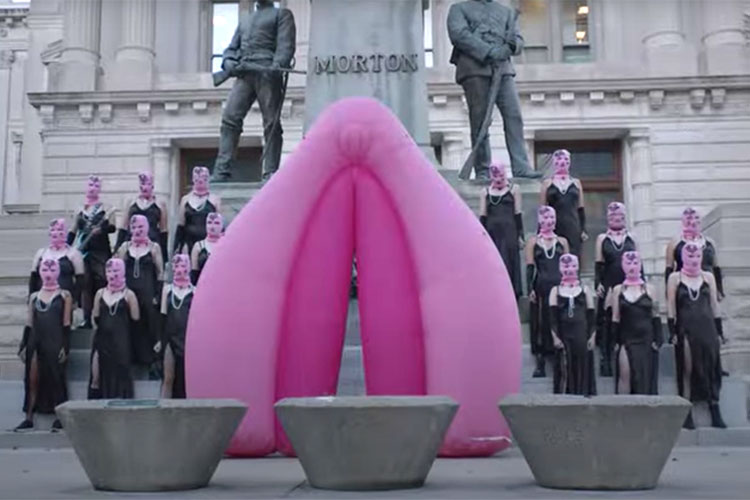 El grupo activista ha compartido un vídeo en el que muestran su acción en el capitolio estatal de Indiana. En él observamos a las integrantes de Pussy Riot vestidas con un atuendo negro y una máscara rosa corriendo por el edificio y hondeando bombas de humo rosa. La imagen más potente del vídeo es la que muestra a todo el grupo en las escaleras del edificio junto a una vagina hinchable de color rosa y de más de tres metros de altura.