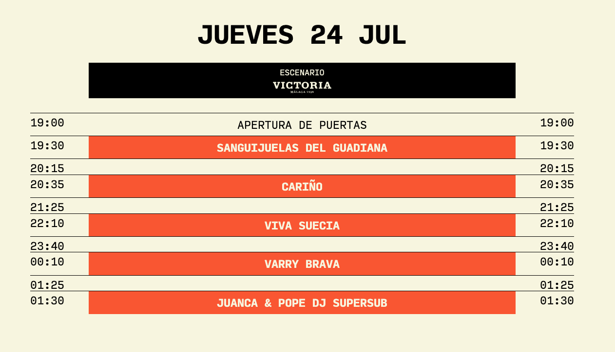 El festival arranca el plato fuerte del fin de semana para cerrar la noche del jueves. Los murcianos Viva Suecia, en estado de gracia y cada vez más asentados en el trono del indie nacional, lideran una jornada inaugural muy coral. Les acompañan en el escenario Victoria Cariño, Varry Brava y Sanguijuelas del Guadiana, si hablamos de bandas en el disparadero podemos decir que los extremeños serán el descubrimiento del verano para todos los que lleguéis pronto a puerto. Para los que decidáis fiesta bucanera hasta el cierre Juanca & Pope Supersub DJ serán vuestros aliados.