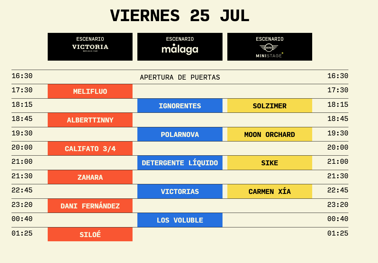 La jornada del viernes amplía horizontes con un line-up ambicioso y variado. Día de nombres propios como Zahara que presenta Lento Ternura, siguiendo ese camino exploratorio también en su directo. Dani Fernández y Siloé son de los artistas más queridos en la capital malagueña donde resuena todavía el directo de los pucelanos en el pasado Oh See! Festival. Destacar de esta jornada del viernes la mirada a esa Andalucía Salvaje que hace el festival con Califato ¾, Carmen Xia o Los Voluble, búsquenlos por los diferentes tinglaos del puerto. Nombres a descubrir si no los conoces ya: Melifluo, Victorias, Polarnova y Detergente Líquido.