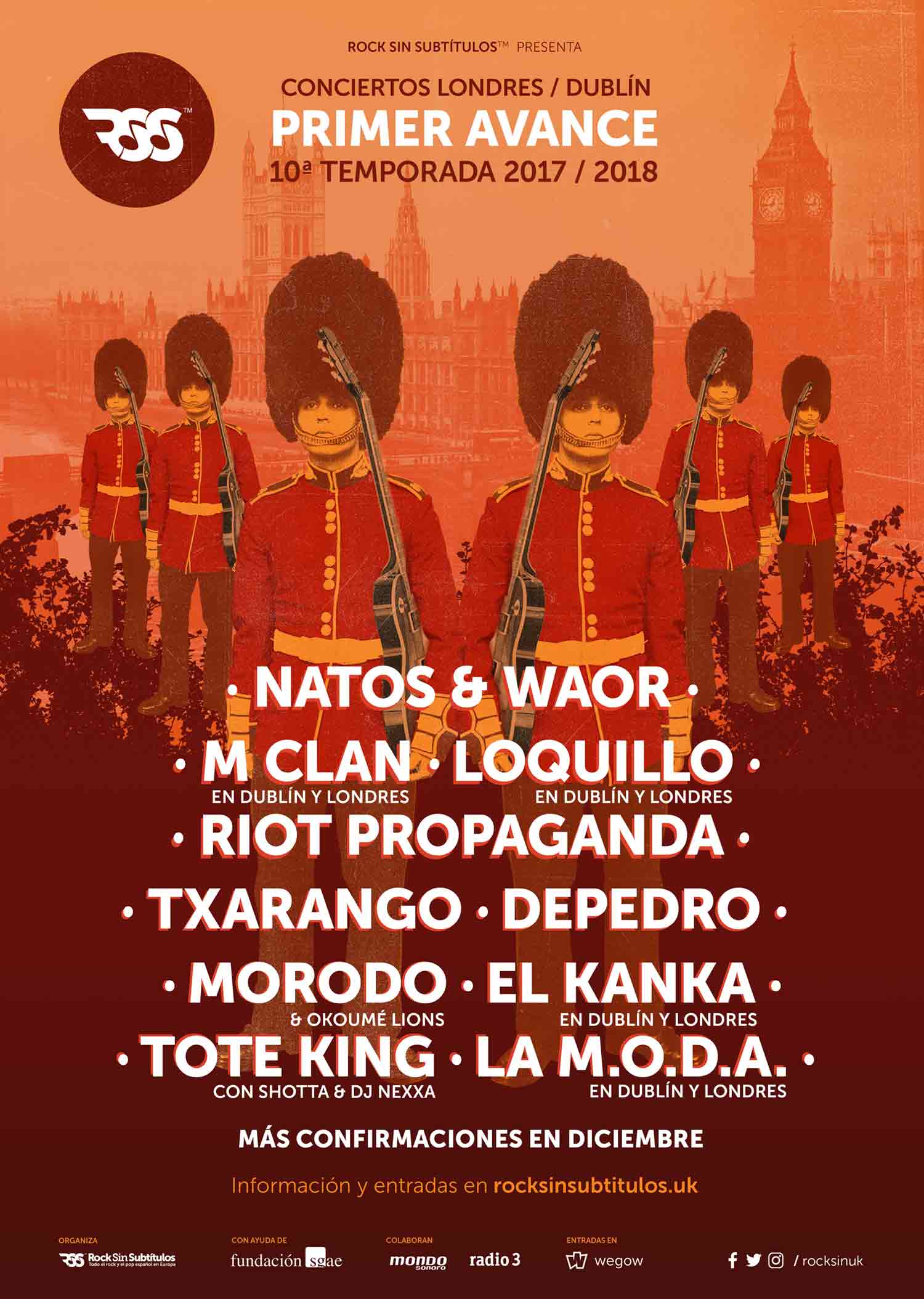 A parte de los ya confirmados M Clan, Loquillo y Natos y Waor; hoy se suman al cartel Riot Propaganda, Txarango, Depedro, Morodo y Tote King con fechas en Londres. Por otro lado El Kanka y La Maravillosa Orquesta del Alcohol visitarán tanto la capital inglesa como la irlandesa, los segundos presentándo su nuevo disco "Salvavida (de las balas perdidas)" (PRMVR, 17). Aquí tienes todas las fechas y detalles.