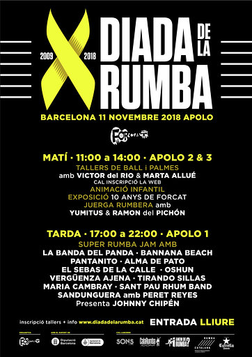 La Diada de la Rumba y la asociación FORCAT (Fomento de la Rumba Catalana) celebran sus 10 años de existencia con actividades para todas las edades, exposiciones, y sobretodo, conciertos. Muchos artistas, cada uno desde su visión propia del estilo, aportarán rumba y más rumba a esta jornada. La décima Diada de la Rumba, que tendrá lugar el 11 de noviembre en la Sala Apolo de Barcelona, recoge una colección de grandes artistas de la rumba que participaran en una Súper Rumba Jam. También habrá talleres de guitarra y baile, y como no, un buen vermut.